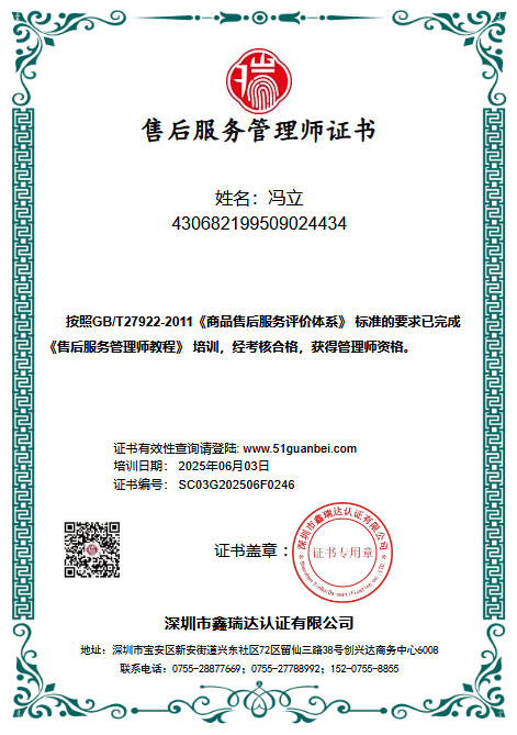 馮立 售后服務(wù)管理師證書
